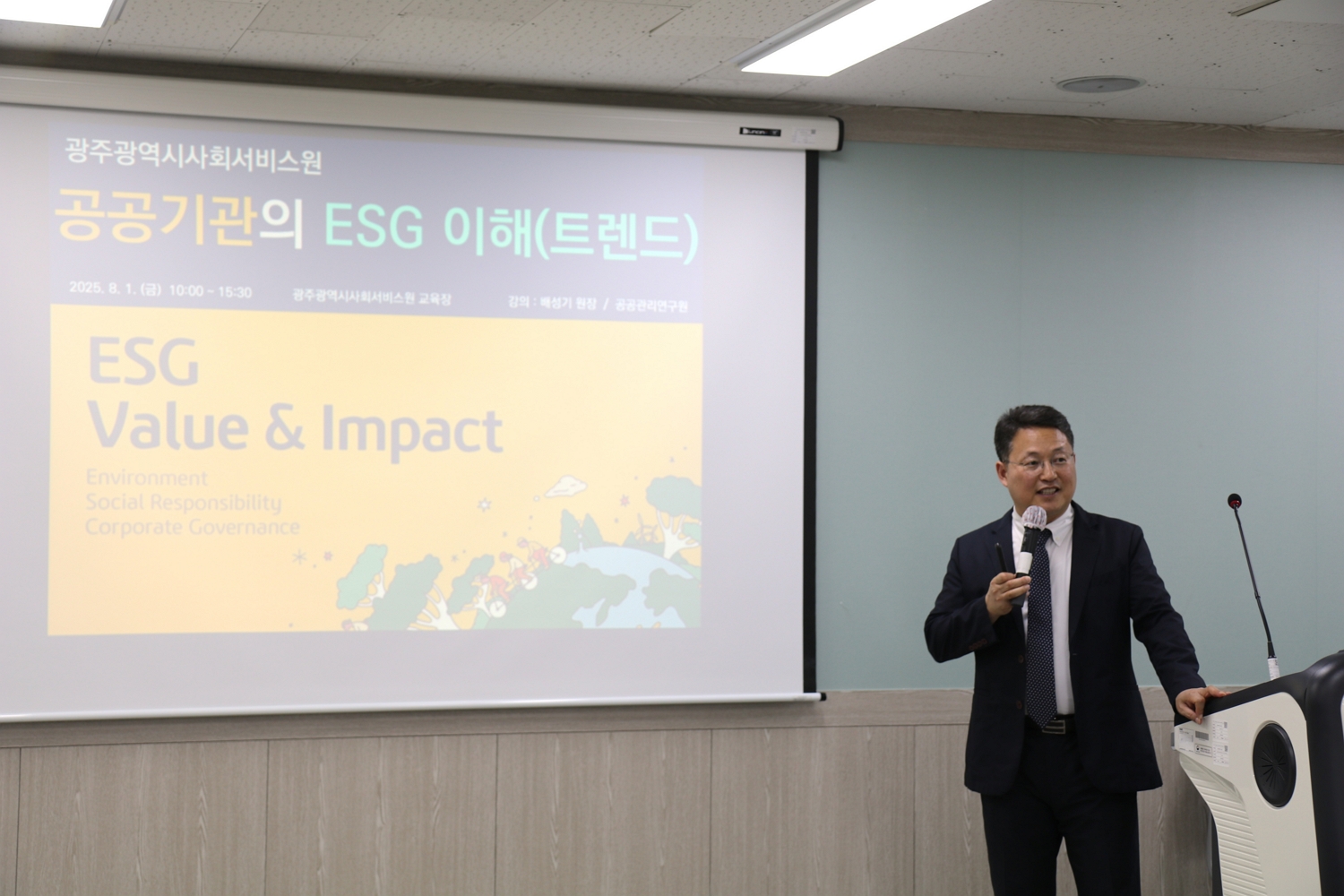 소셜임팩트랩코리아 배성기 소장은 지난 8월 1일, 광주광역시사회서비스원 임직원 및 소속기관 기관장을 대상으로 「공공기관의 ESG 트렌드」 특강을 진행했다. 이번 강의는 공공기관의 ESG 경영에 특화된 내용을 위주로 구성되었으며, 유관 기관의 우수 적용사례 등 ESG와 관련된 최근 이슈를 다루었다. 특히, 공공기관 실무자들이 ESG 흐름과 실천 전략을 체계적으로 이해할 수 있도록 ESG에 대한 기초적인 내용과 현황을 소개하며 강의를 시작했다.
